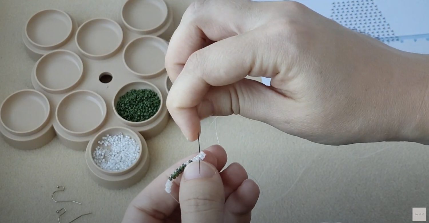9. Pull the thread tight. Take the next 2 beads: color C (dark green) and A (white). Pull the needle UP through the beads 5 & 6.
