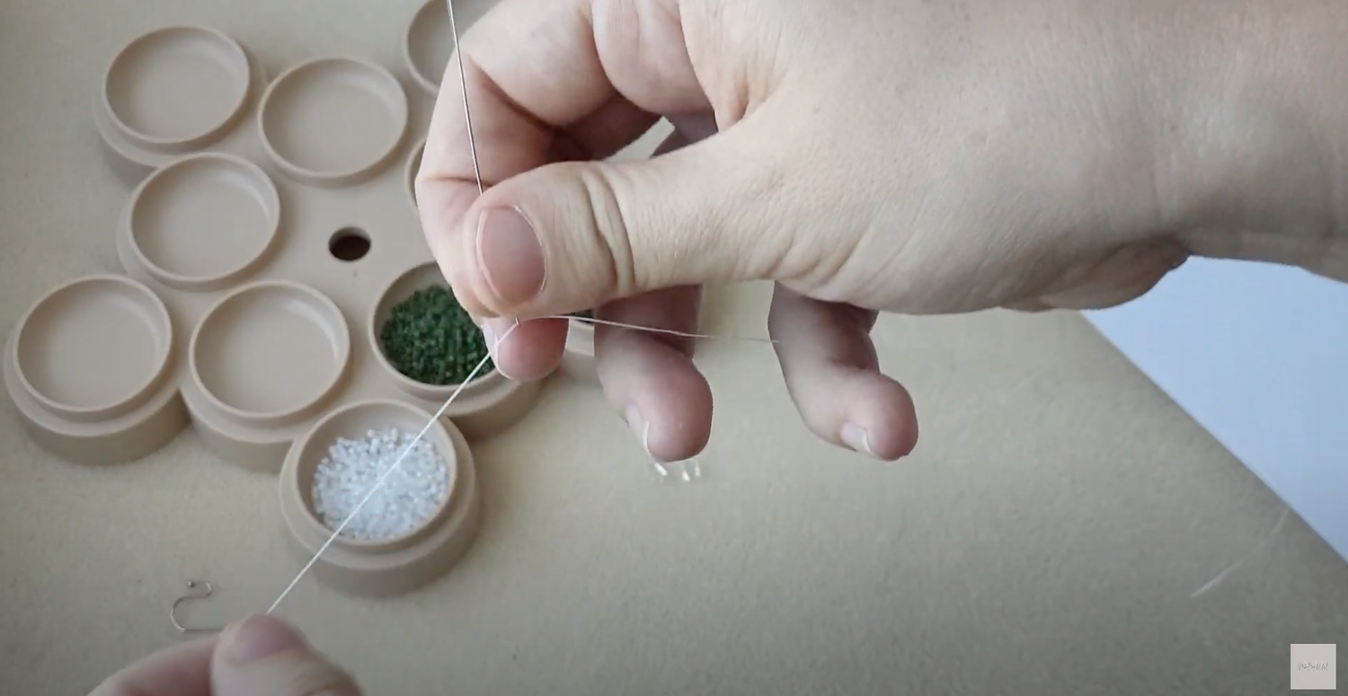 1. Cut a long piece of beading thread. The length depends on your preference, you can either cut a really long one and deal with it, or you can cut it shorter and add another one later. I prefer the loooong one :) Also here’s my lifehack: I start beading from the center of a long thread, leaving a half of it for adding fringe later.