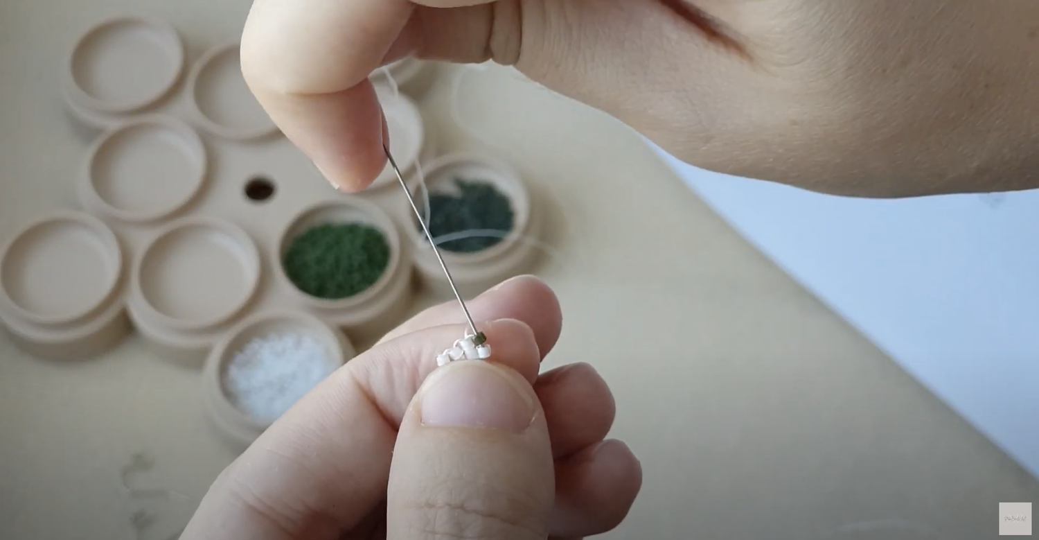 4. Now here’s a tricky part. Form a loop of these 4 beads and pull the needle through the first 2 beads again.
